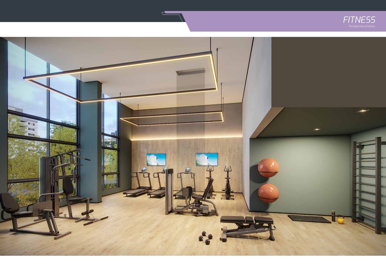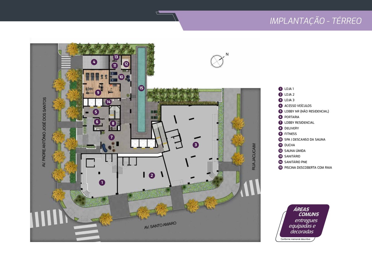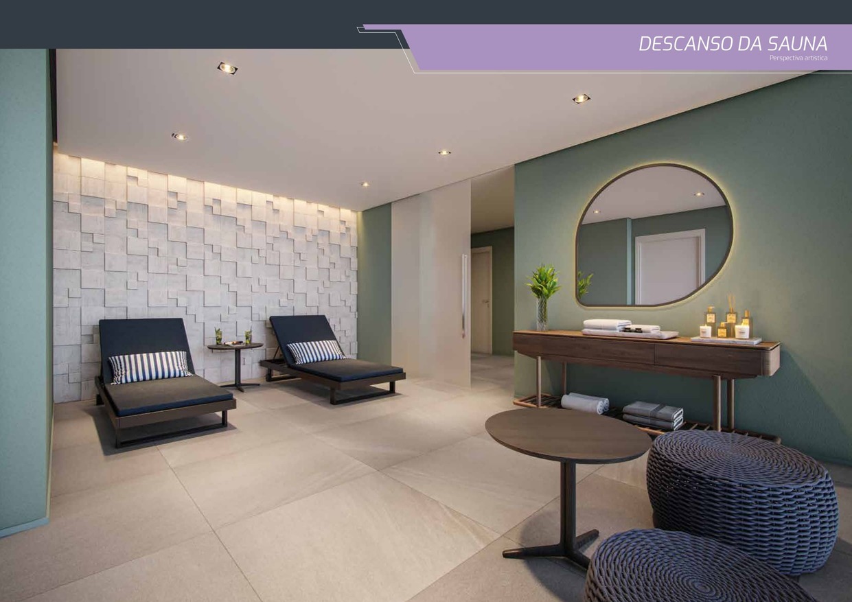 Térreo: Lobby residencial, espaço para delivery, fitness, SPA com sauna úmida, ducha e área de descanso, além de piscina com raia.