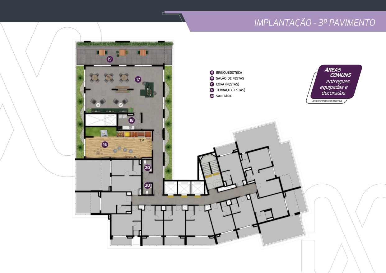 3º Pavimento: Salão de festas com copa, terraço coberto e descoberto, além de brinquedoteca.